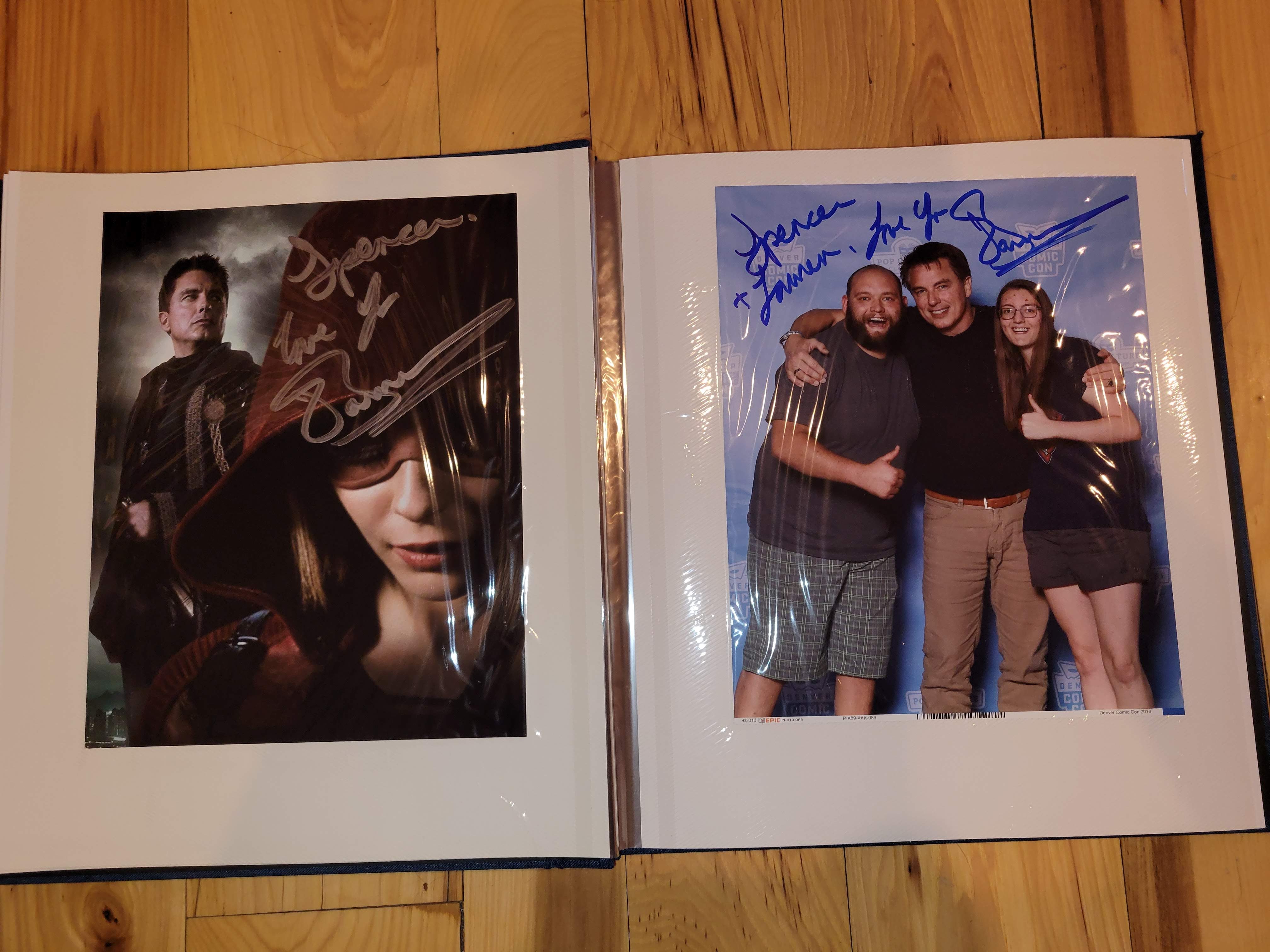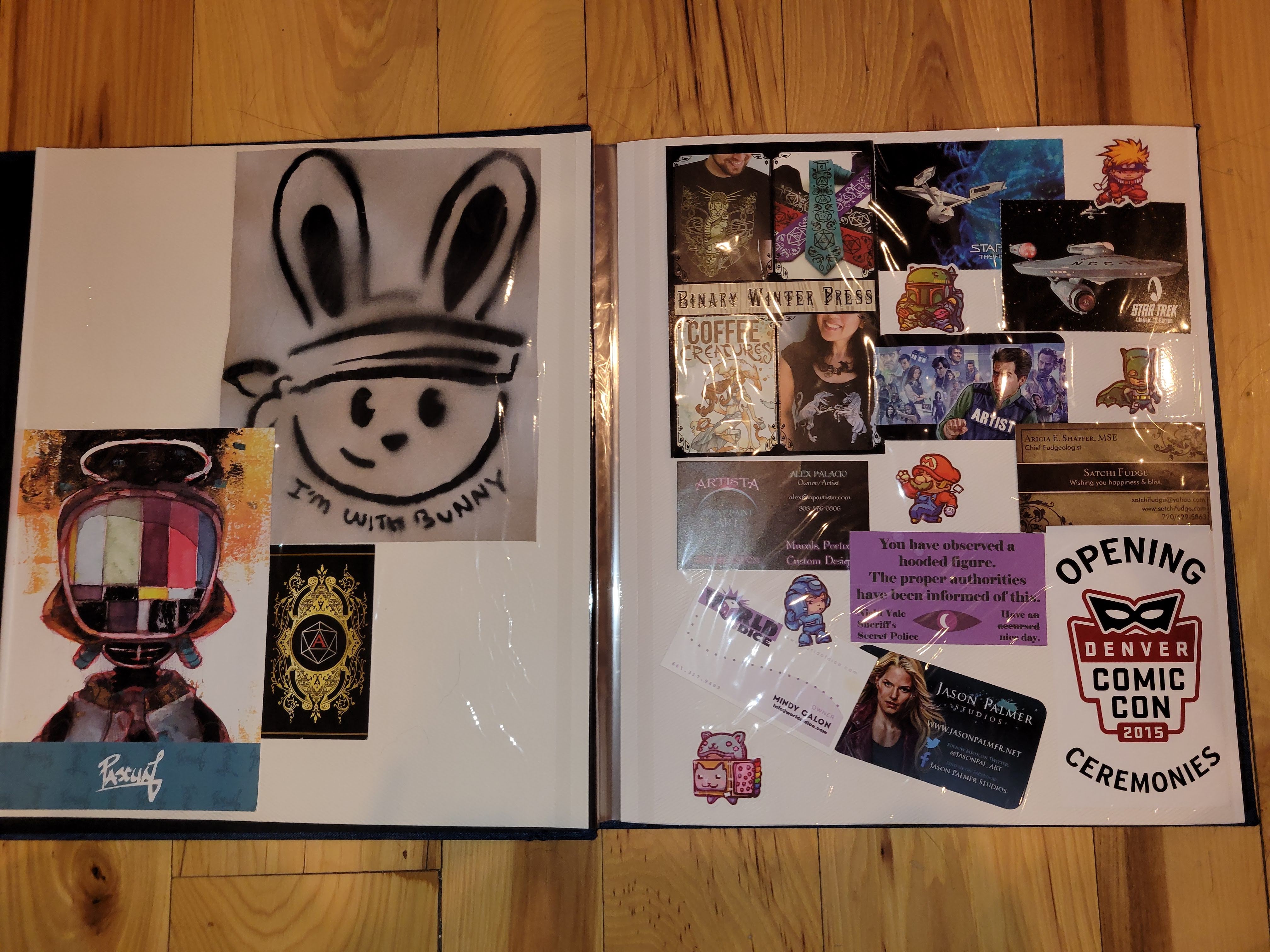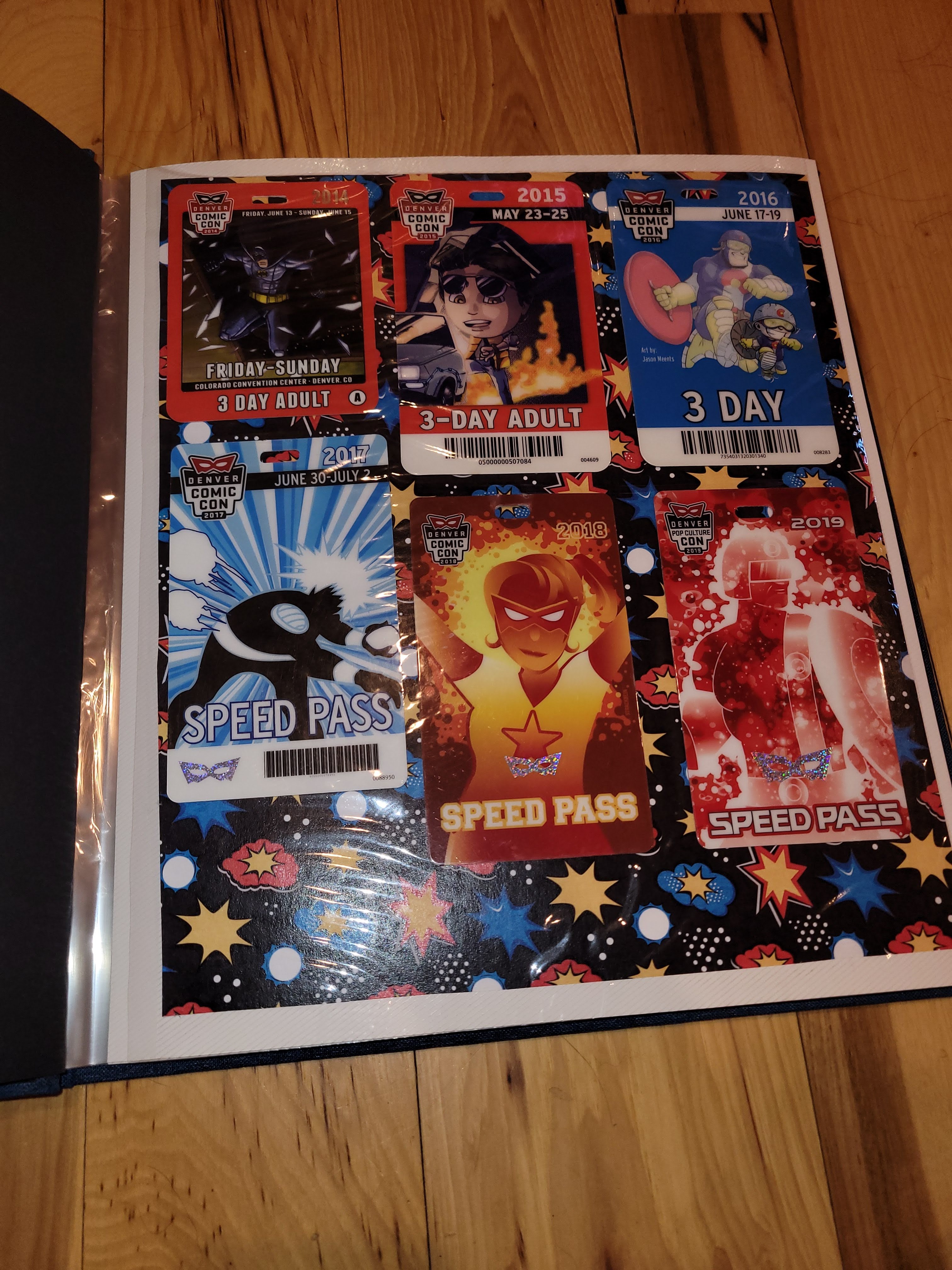 I have put together a scrapbook of my brother’s and I Comic Con adventures and for some odd reason I have 0 photos and he has them all. What I do have however is loads of artwork and the professional photo ops, as well as all the random cards and stickers from booths over the years. For the most part I kept everything we ever got from any con in my bottom dresser drawer and now all that hoarding has paid off!